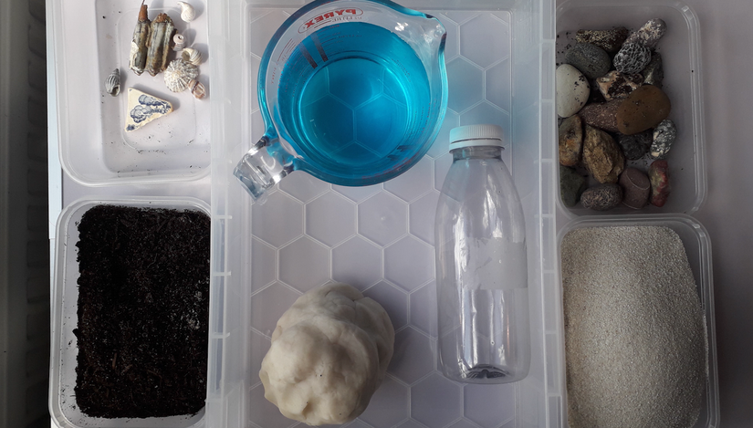 The stones will represent those left by retreating glaciers after the last ice age. Potting soil can be added to represent the peat of old land surfaces. Playdough to stand in for clay, which is very fine rocks which often mixes with water to make mud or silt. And finally, sand as the modern seabed. You can include shells or anything else in different layers as markers for how much of your beach has eroded.