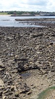 Rock built foundations on the Black Middens. 3-sided, rectangular in shape with cut out centre. Directly down hill below Volunteer Life Brigade Watch House.